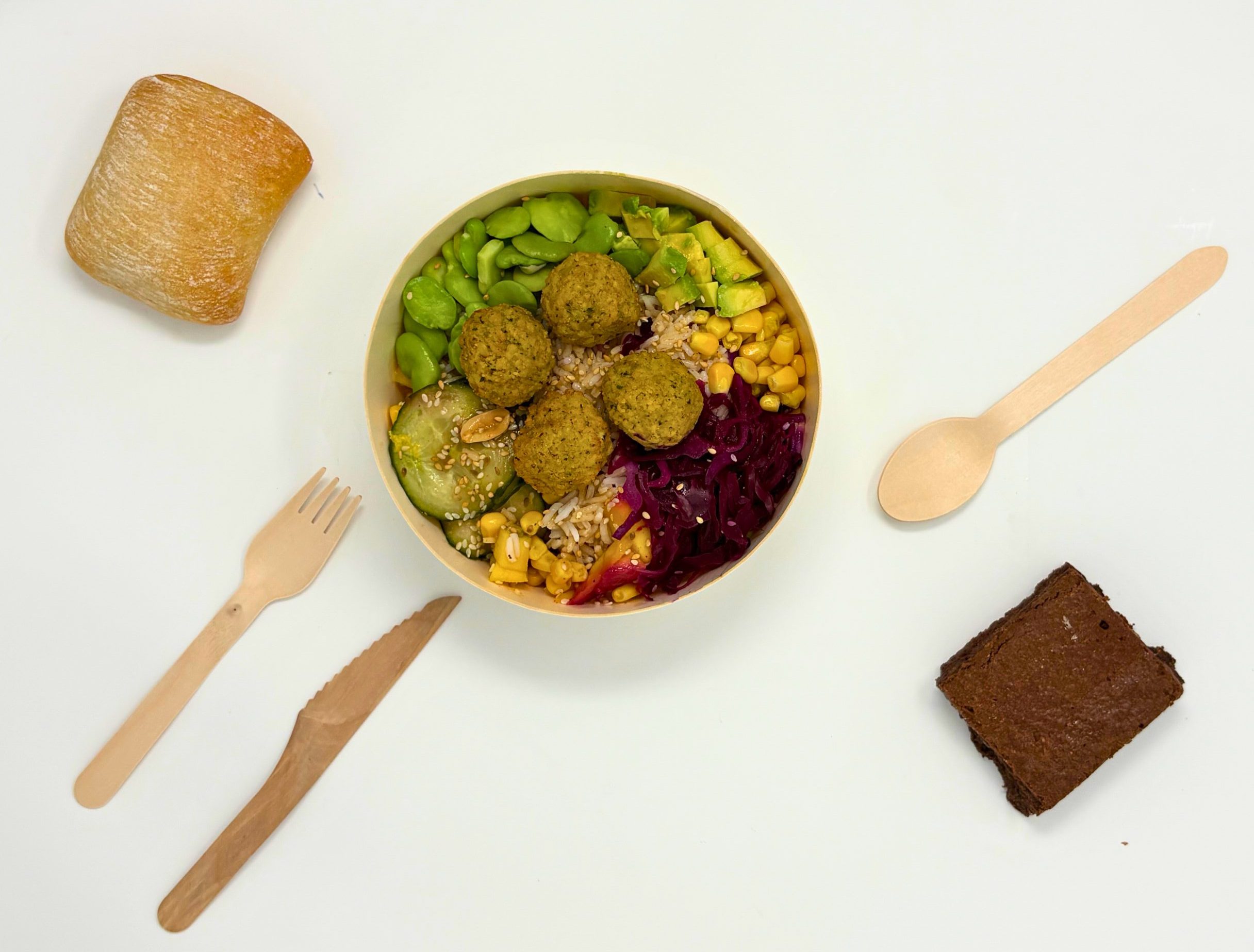 Poke Bowl composé de riz, morceaux de mangue, dés d’avocat, carotte râpée, chou rouge, fèves et falafel (~270 grammes) ;