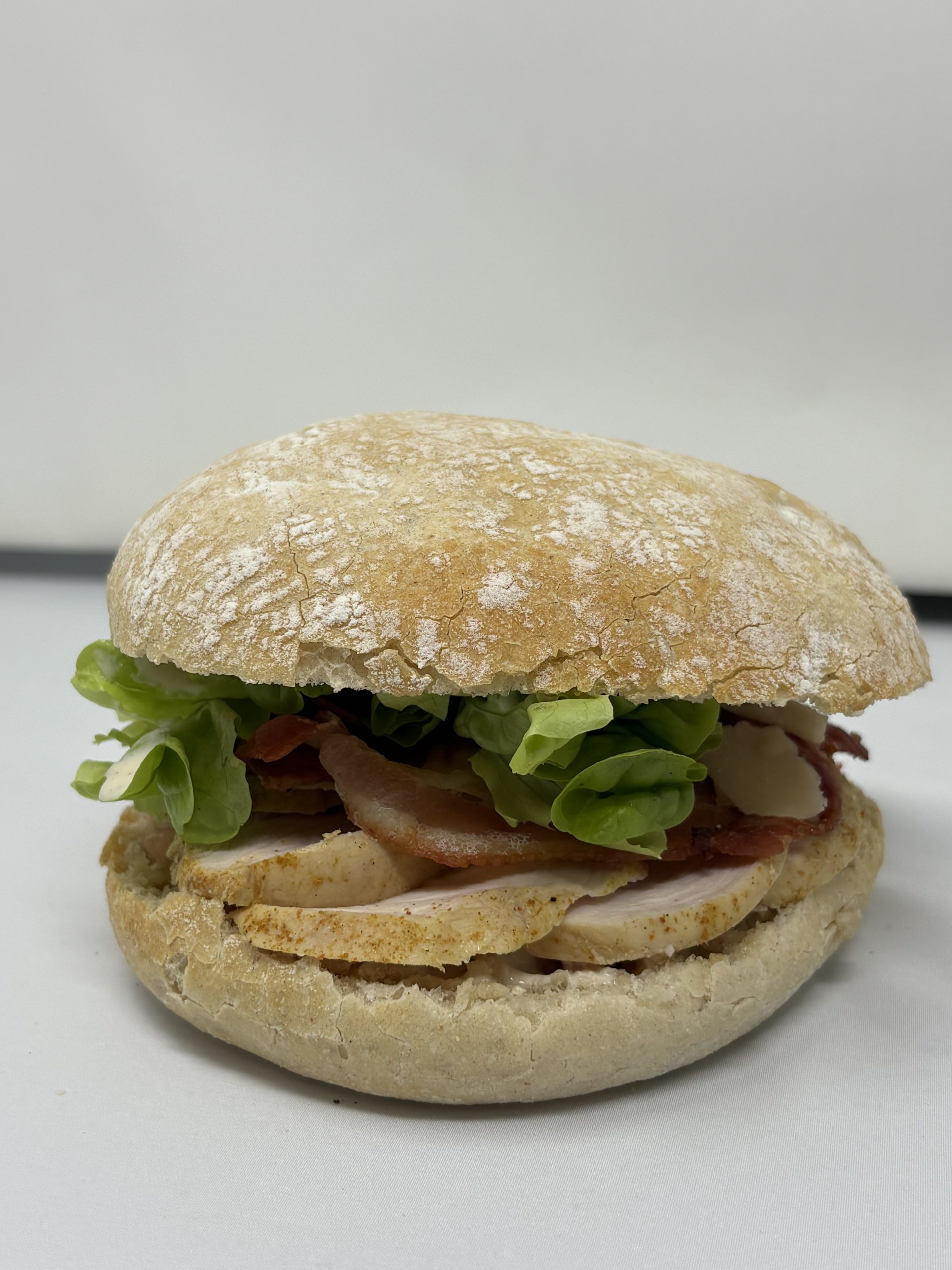 Sandwich : Baguette aux céréales garnie de saumon fumé, salade verte, tartare de concombre, oignons rouges crème cheese