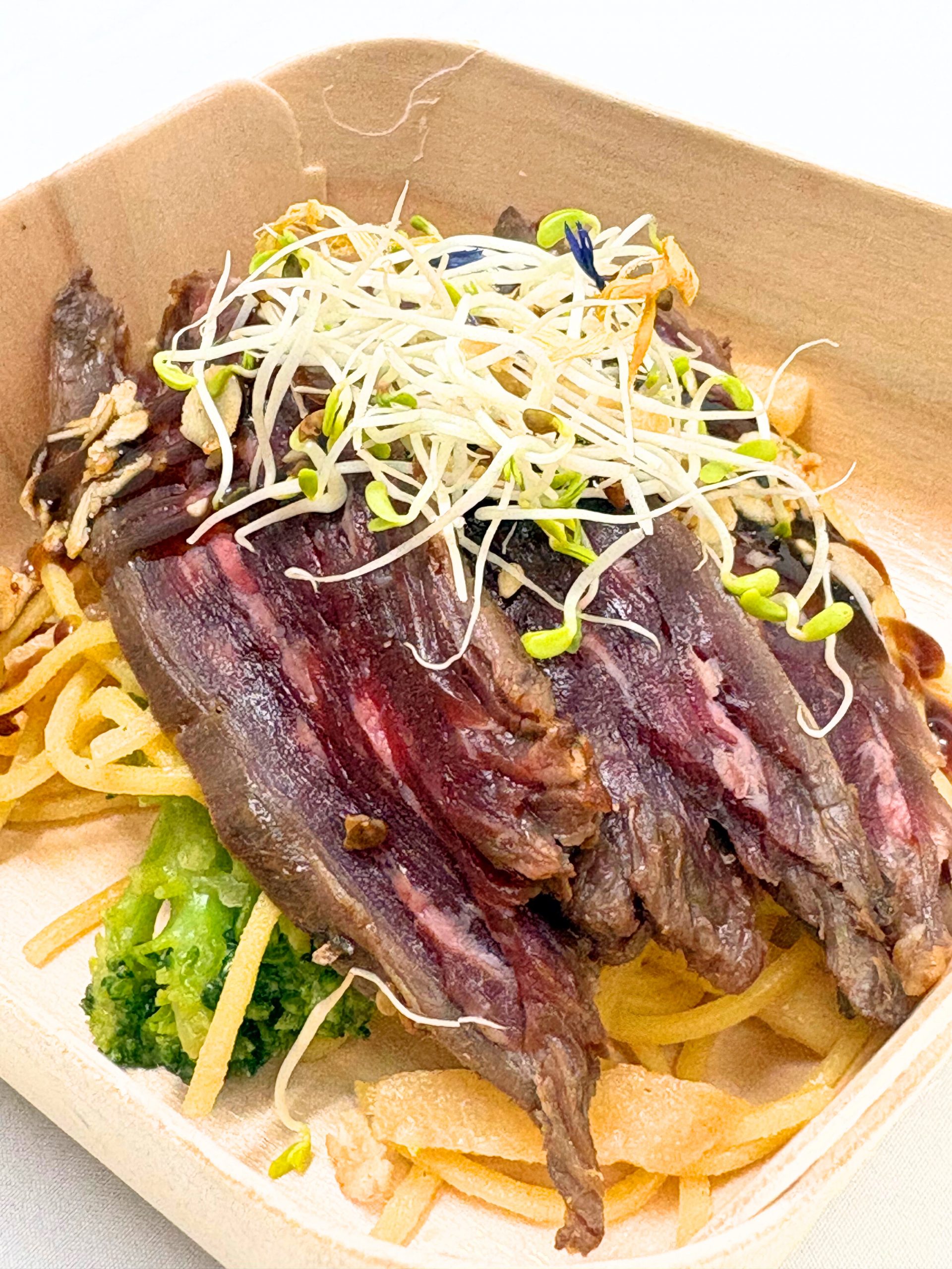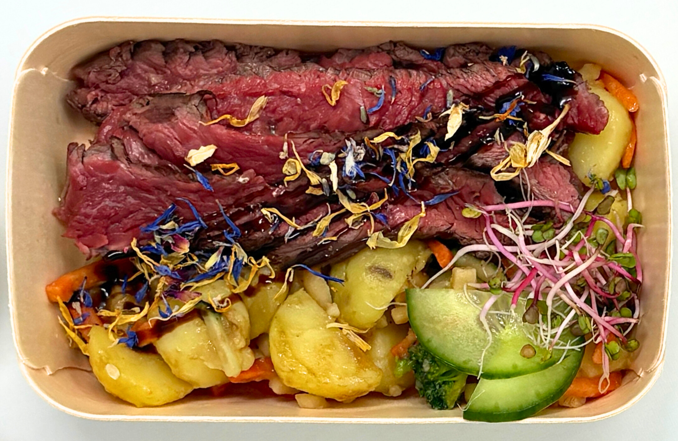 - Emincé d’onglet de bœuf et sa salade de pommes de terre aux petits légumes