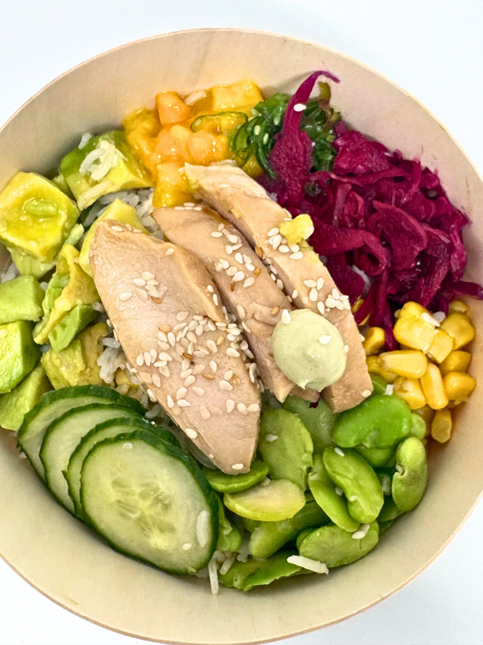 Poke Bowl Poulet composé de riz, poulet mariné Sauce soja et sésame, morceaux de mangue, dés d’avocat, salade de chou rouge, fèves, algues, maïs et concombres (~270 grammes)