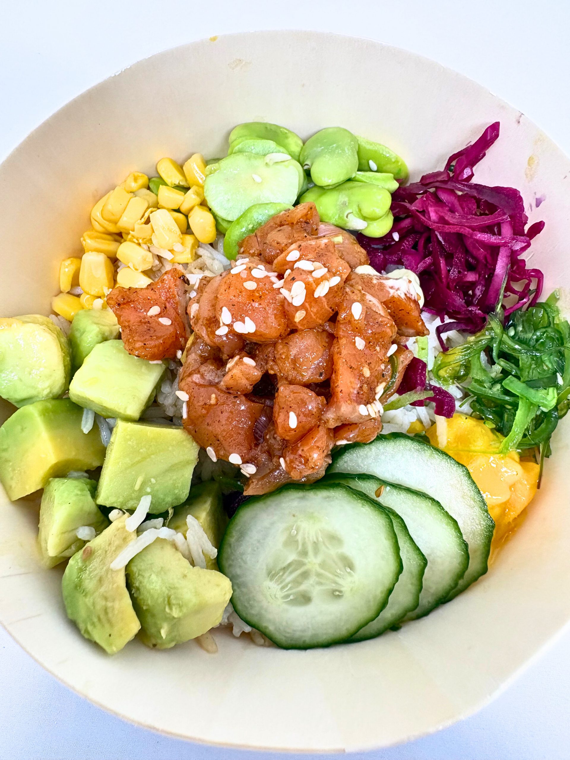 Poke Bowl Saumon composé de riz, morceaux de mangue, dés d’avocat, carotte râpée, chou rouge, fèves et saumon mariné sauce soja (~270 grammes) ;