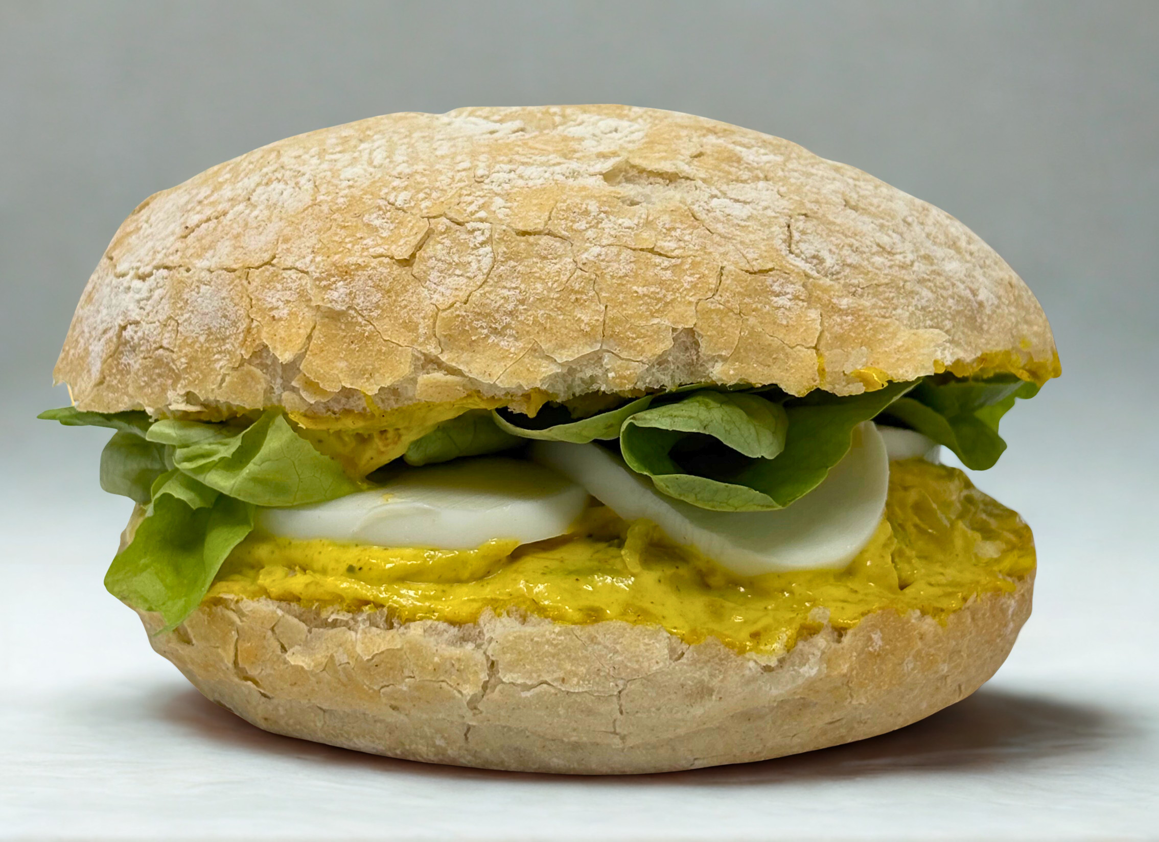 Pain bagnat garni de poulet au curry, salade verte et œufs durs