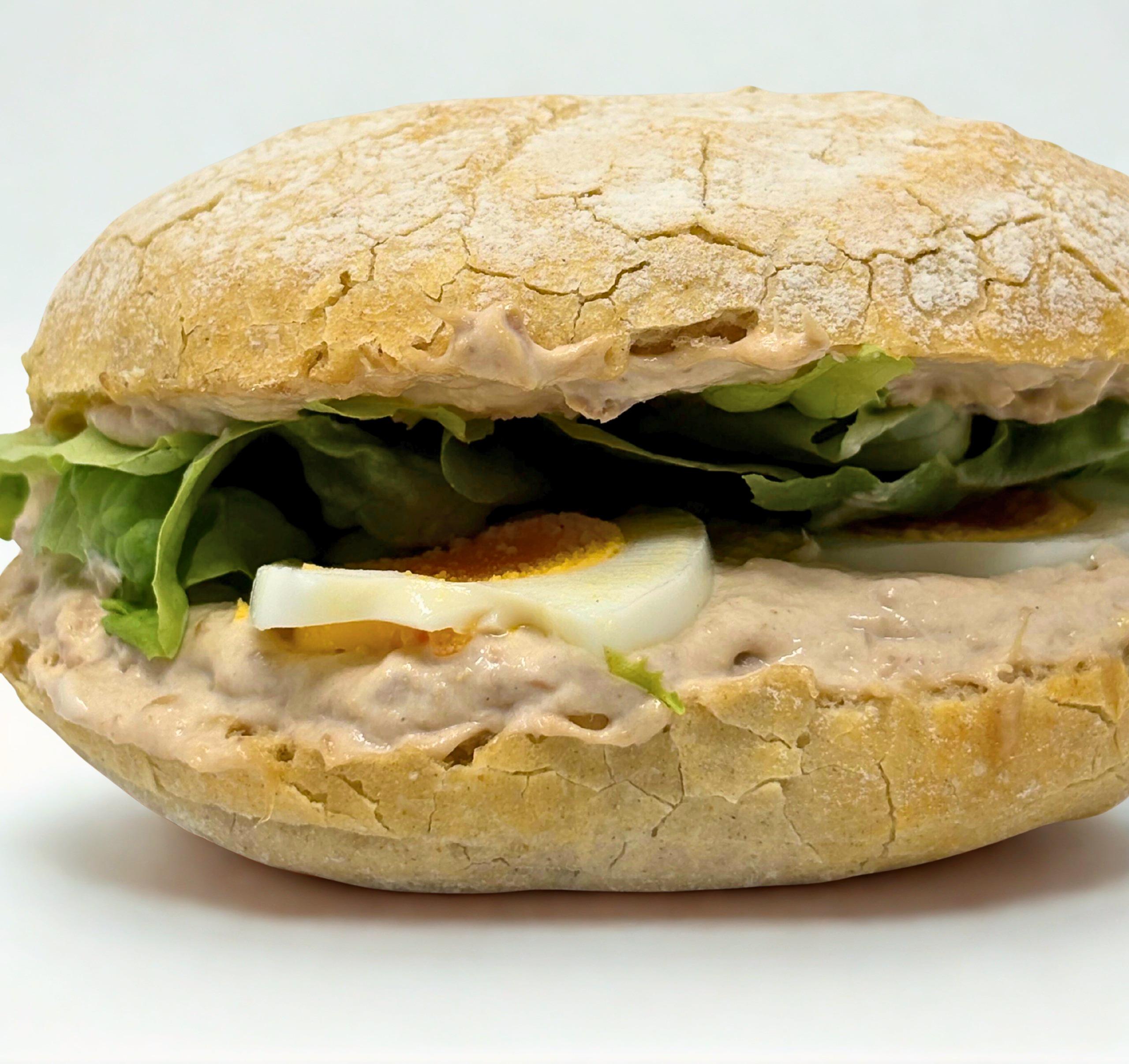 Pain bagnat garni de thon mayonnaise, salade verte, carottes râpées et œufs durs